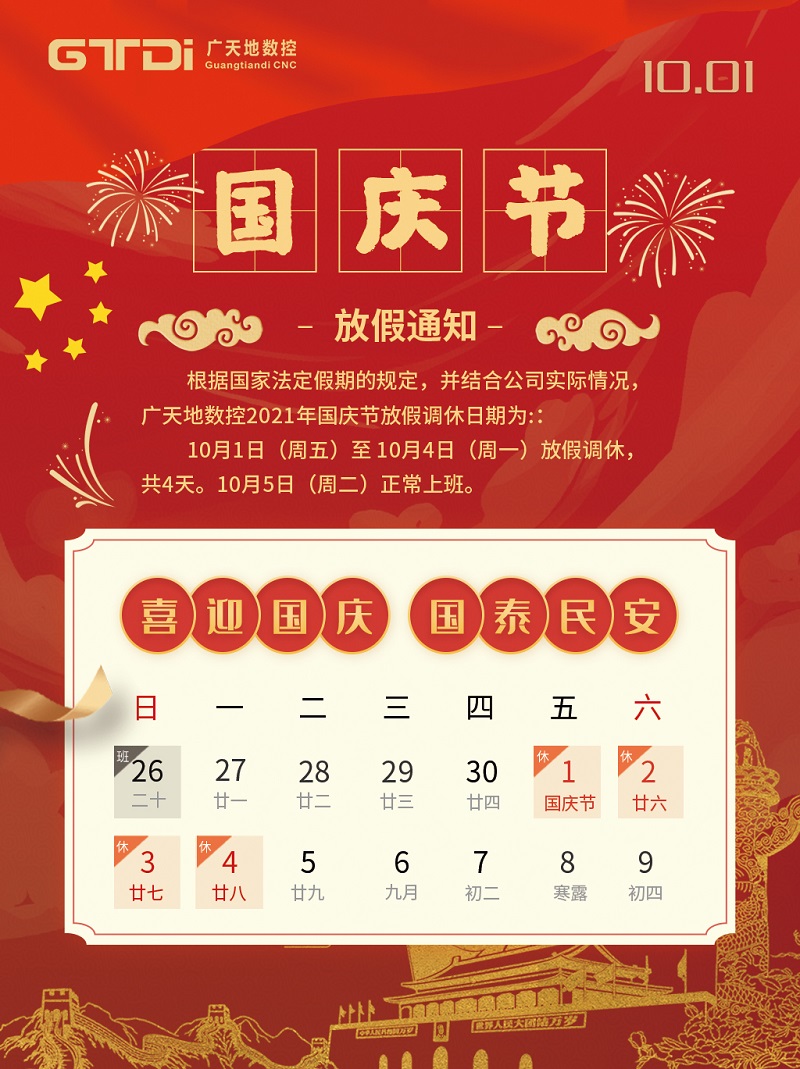 2021年国庆节放假调休日期为:10月01日(星期五)至10月04日(星期一)放假调休,共4天。10月05日(星期二)正常上班。