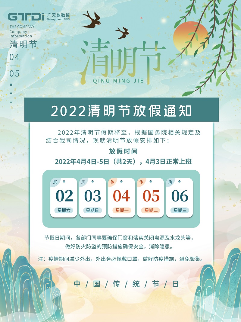 根据国务院办公厅《关于2022年部分节假日安排的通知》,并结合我司实际情况,永利304数控2022年清明节放假安排如下: